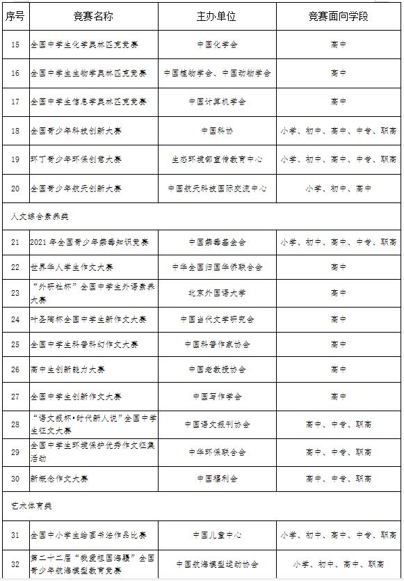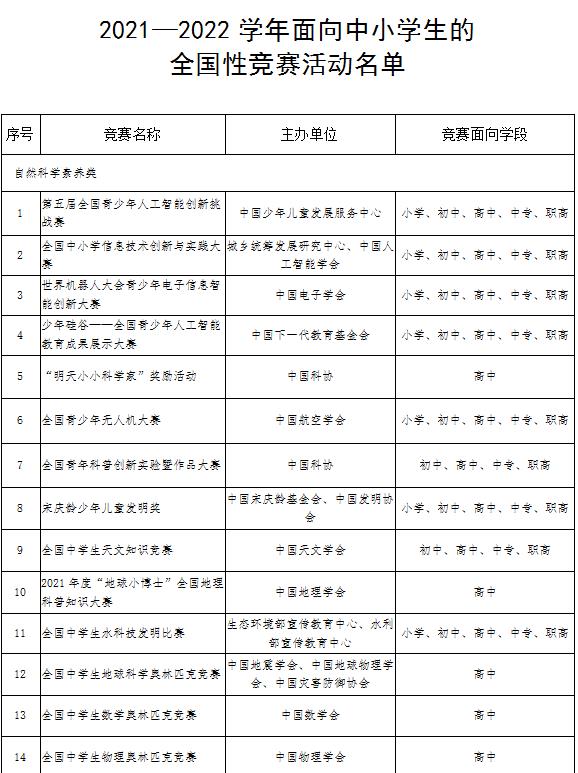 附件:2021—2022学年面向中小学生的全国性竞赛活动名单