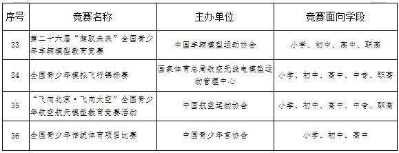 根据《教育部办公厅印发〈关于面向中小学生的全国性竞赛活动管理办法(试行)〉的通知》(教基厅〔2018〕9号,以下简称《管理办法》)精神,由主办单位自主申报,经组织专家进行评审、公示和复核等程序,确定“第五届全国青少年人工智能创新挑战赛”等36项竞赛活动为2021—2022学年面向中小学生的全国性竞赛活动,举办时间原则上为2022年8月前。