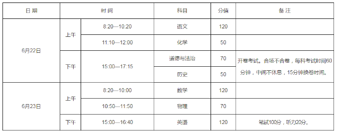 今年中招考试时间为6月22日—23日。实行全省统一命题、统一试卷、统一考试时间。各地按照国家和省有关要求,统一制订本辖区的考试招生工作方案,负责考务、阅卷和录取工作。