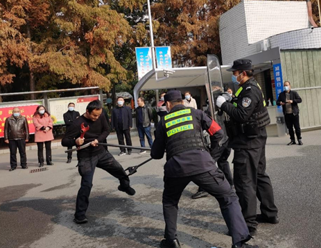 特警队员详细讲解了警棍、防暴盾牌、防暴钢叉、防暴脚叉的使用注意事项,并进行了现场演示。
