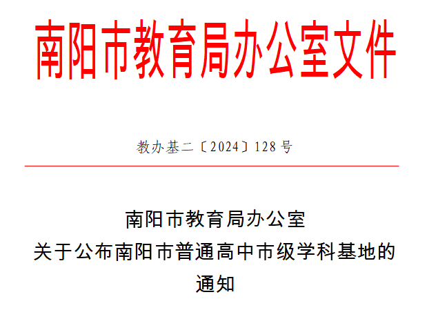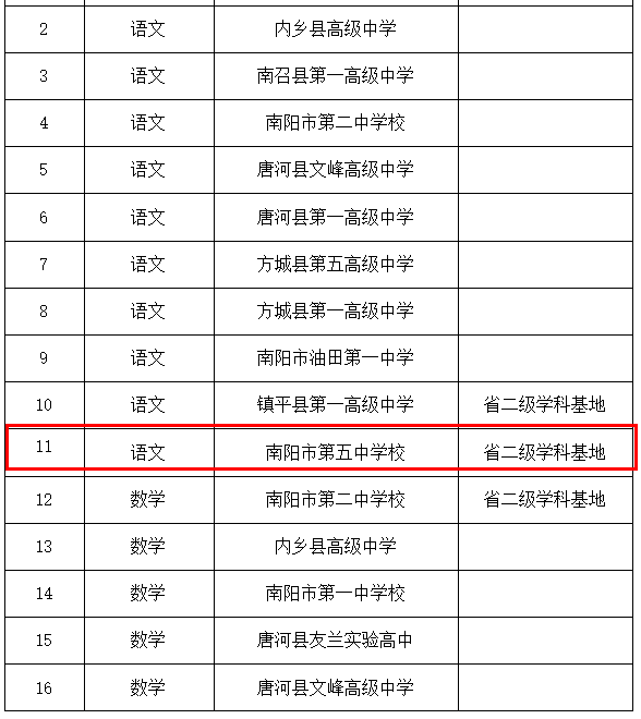 近日,南阳市教育局公布全市各学校共60个学科基地名单。南阳市五中语文、历史、英语、物理、地理、生物六个学科入选,其中语文、历史学科为省二级学科基地。我校是南阳市唯一有两个高考学科获评省级学科基地的高中,也是我市有两个学科获评省级学科基地的两所高中之一。