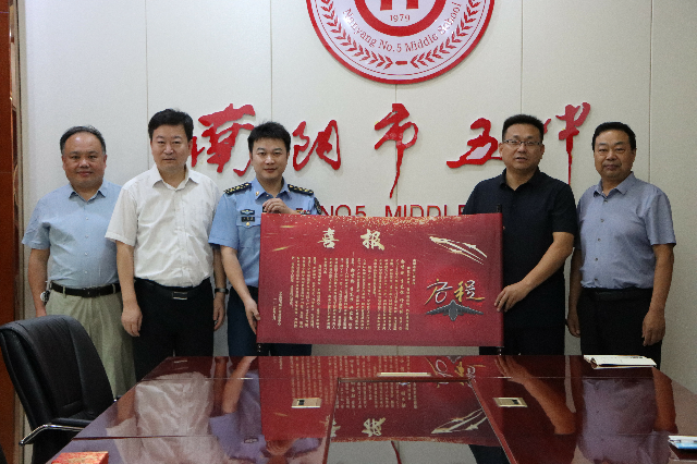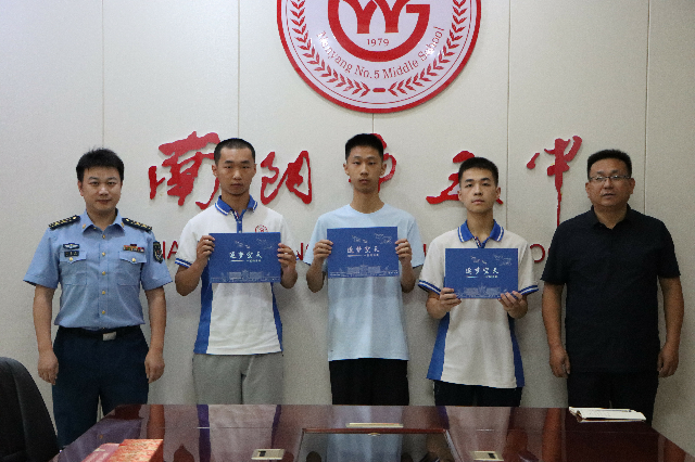 当梦想照进现实,当青春与蓝天相约,南阳市五中的校园里洋溢着别样的激动与自豪。7 月 17日上午,空军招飞局济南选拔中心组织计划科科长朱星桥中校、南阳市教育考试中心主任田斌、南阳市教育考试中心高招科科长刘磊、南阳市宛城区教育考试中心副主任李燮一行专程来到南阳市五中,为李东恒、许家栋、郭贤彬三名学子颁发空军飞行员录取通知书,并举行了隆重的欢送仪式。这不仅是三位学子的荣耀时刻,更是南阳市五中育人成果的又一见证。