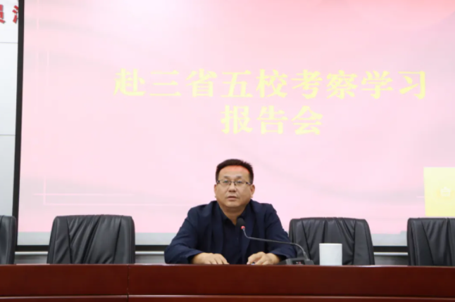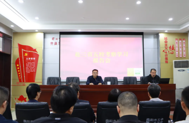 对标先进找差距,见贤思齐谋发展。从“诸葛躬耕地”南阳,到“子云读书处”西蜀,此次渝川鄂三省考察学习,赵学敏校长深受触动,思虑良多。为将此次考察学习成果转化为未来五中发展的生动实践,南阳市五中于11月1日下午,在笃行楼一楼会议室召开了“赴三省五校考察学习报告会”。会上,赵学敏校长全面总结了此次渝川鄂三省五校考察所感、所悟、所想,结合五中校情,作了《全面深入贯彻党的教育方针,推动五中高质量发展》的专题报告,与同志们进行了深入的交流。会议由校长助理陈新阳主持。