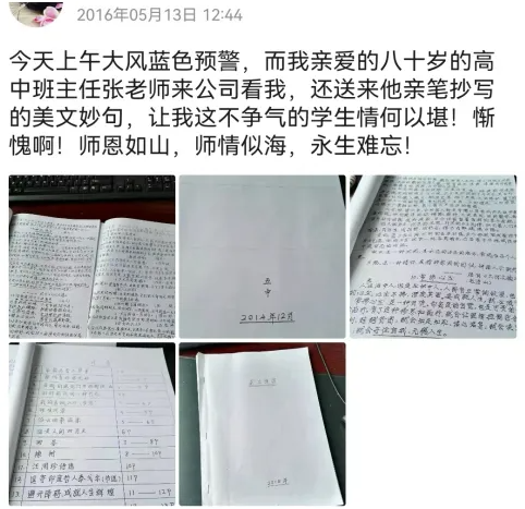 我们的班主任“套子”老师张永宸虽然对学生严格,但对学生的爱是刻在骨子里的。我身体不好,师娘按时为我煎好中药,我也被同学戏称药罐子。2016年,一个刮着大风的日子,老师和师娘去公司看我,送来了他手写的美文佳句让儿子学习(文稿被同事看到后争相索要复印了无数份)。我送老师下楼,师娘说:“娃,你忙别送了,要注意身体啊!”我这不争气的学生让八十岁高龄的老师牵挂真是惭愧啊!出大门后,当保安知道两位慈祥的老人是我老师后,他吃惊又羡慕地说:“你好幸福啊!”我把老师手稿发朋友圈后,他的老少学生一看就说这是张永宸老师的楷书。