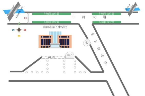 1.学校车位有限,请大家尽量低碳环保出行,如确需驾车,可停放在卧龙桥与淯阳桥之间的白河大道两侧(详见停车示意图)