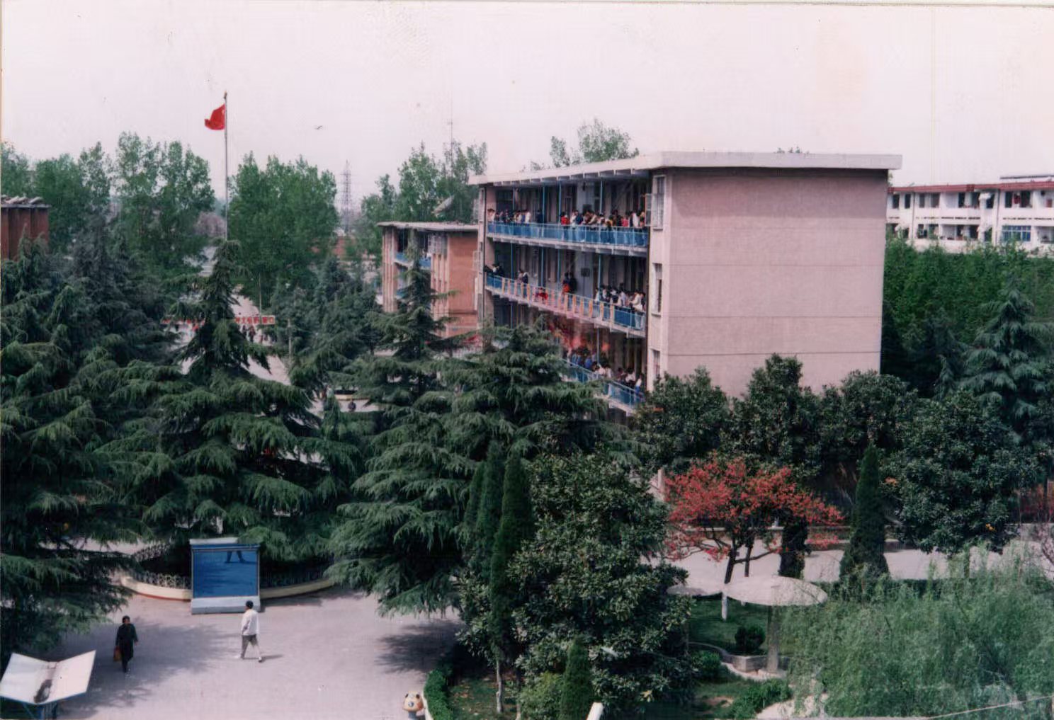 从五中老大门远眺校园,可以看到大花坛,原一号教学楼,实验楼