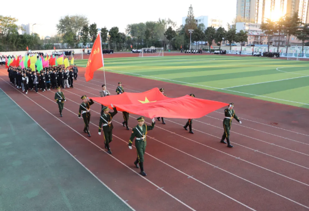 国旗护卫队迈着铿锵有力的步伐护送五星红旗入场,每一步都踏出少年的坚毅。当国歌奏响,全体师生肃立齐唱,激昂的旋律中,爱国情怀与集体荣誉感在绿茵场上激荡升华。
