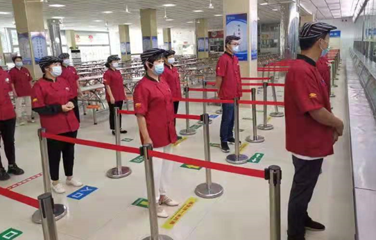 对餐厅各区域进行消毒,监测点放置84消毒液和酒精消毒壶及口罩,人员进入前手部测量体温;地面张贴间隔1米线,所有人员前后左右间隔1米,排队进入;进入餐厅后,根据地标线指引,到达洗手池用七步消毒法进行手部消毒。根据大厅指示线排队就餐,间隔一米排队,单桌交叉就餐;就餐结束后,携带自己餐具到指定位置倾倒餐厨废弃物,离开餐厅。